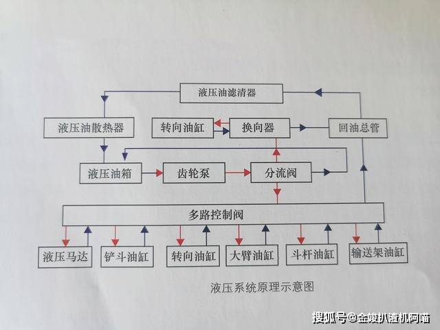 液壓油經過齒輪泵加壓到多路轉向閥,通過操縱相關手柄控制對應的閥路把液壓油輸送到個控制油缸,馬達,而后馬達完成挖掘,行走,輸送等動作。當不工作是,液壓油經多路閥向閥中間油道經過濾清器過濾再又散熱器散熱后回流至油箱內。